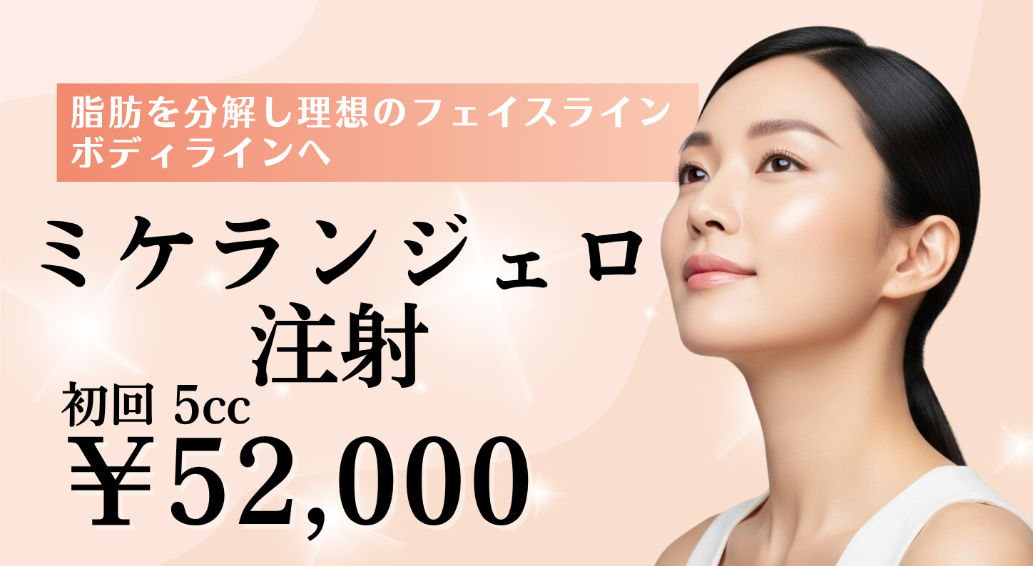 ミケランジェロ注射は、脂肪溶解作用と代謝促進作用を併せ持つ次世代のフェイス&ボディシェイピング注射です。従来の脂肪溶解注射に比べ、