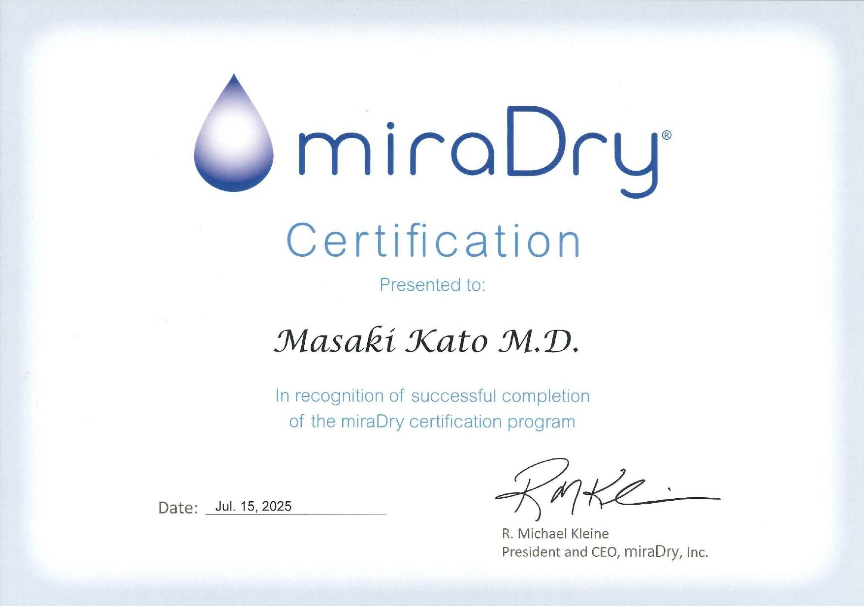 まゆりなclinic名古屋栄院長はミラドライ公式「認定医ディプロマ」を取得しております。これは、専門的な知識と技術を習得し、ミラドライ公式Miramar Labs社が認定する医師にのみ与えられる資格です。また、当院ではこれまでに多数のミラドライ症例を手掛けており、豊富な経験に基づいた治療をご提供しています。「効果をしっかり出したい」「安全性が気になる」という方にも、安心しておまかせいただけます。