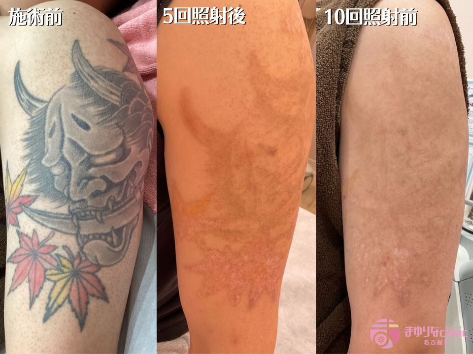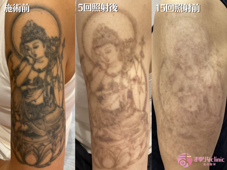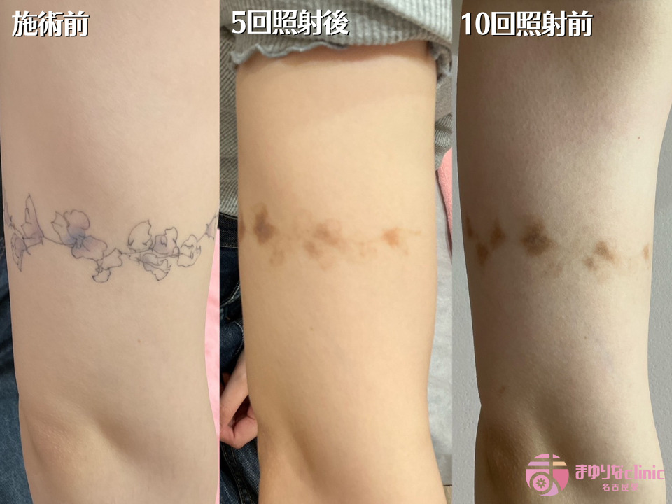 まゆりなclinic名古屋栄では、アメリカのキュテラ社製のピコレーザーエンライトンというレーザーを用いてタトゥーを除去します。エンライトンは日本では厚生労働省の認可を受けています。ピコ秒(1兆分の1秒)という極めて短い時間にレーザーエネルギーをタトゥーに照射することにより生じる光音響効果により、タトゥーのインク粒子を小さな破片に粉砕し、リンパ系を介して取り除きます。タトゥーのインク粒子が取り除かれるにつれて、徐々にタトゥーが薄くなり、インクのない肌が現れてきます。色素を細かく分解するため、お肌へのダメージが残りません。タトゥー以外の周辺組織を傷つけることなく色素のみを破壊することができます。エンライトンは、タトゥーのインク色に深く関係する波長とパルス幅の多種設定による複数の波長で従来のナノレーザーの黒・紺色のタトゥーだけでなく、様々なカラーインク色(赤・緑・黄)にも対応可能なりました。従来のレーザーに卜比べて1,000倍速くレーザー照射を行うことにより、今まで以上に少ない治療回数で綺麗に取り除きます。エンライトンは従来のレーザーに比べて照射時の痛みも軽減されています。